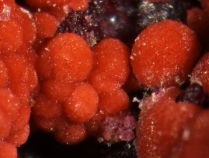 Kulovité agregáty uraninitumísta s bílými inkluzemi clausthalitu obrůstané umangitem (Cu-selenid – růžově fialové anizotropní agregáty), opuštěné uranové ložisko Zálesí v Rychlebských horách. Šířka záběru 700 μm, foto v odraženém světle (částečně zkřížené nikoly), foto Jiří Sejkora