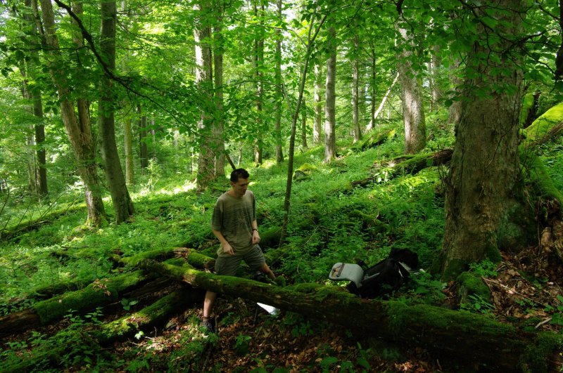 Dokumentace výskytu hlívovce ostnovýtruséhoPracovník mykologického oddělení dokumentuje výskyt zákonem chráněné houby hlívovce ostnovýtrusého v přirozeném suťovém lese na Šumavě.
